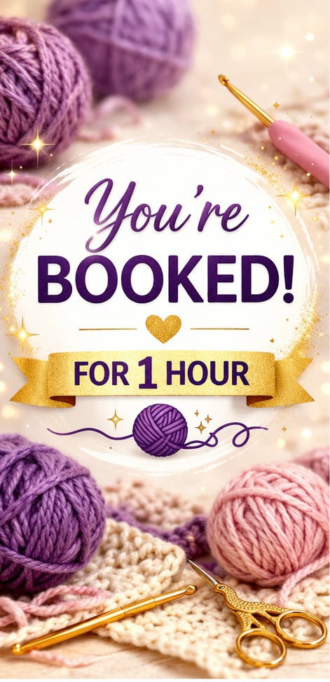 Learn crochet step-by-step in a personalized one-on-one session. Perfect for beginners or anyone looking to improve their skills.