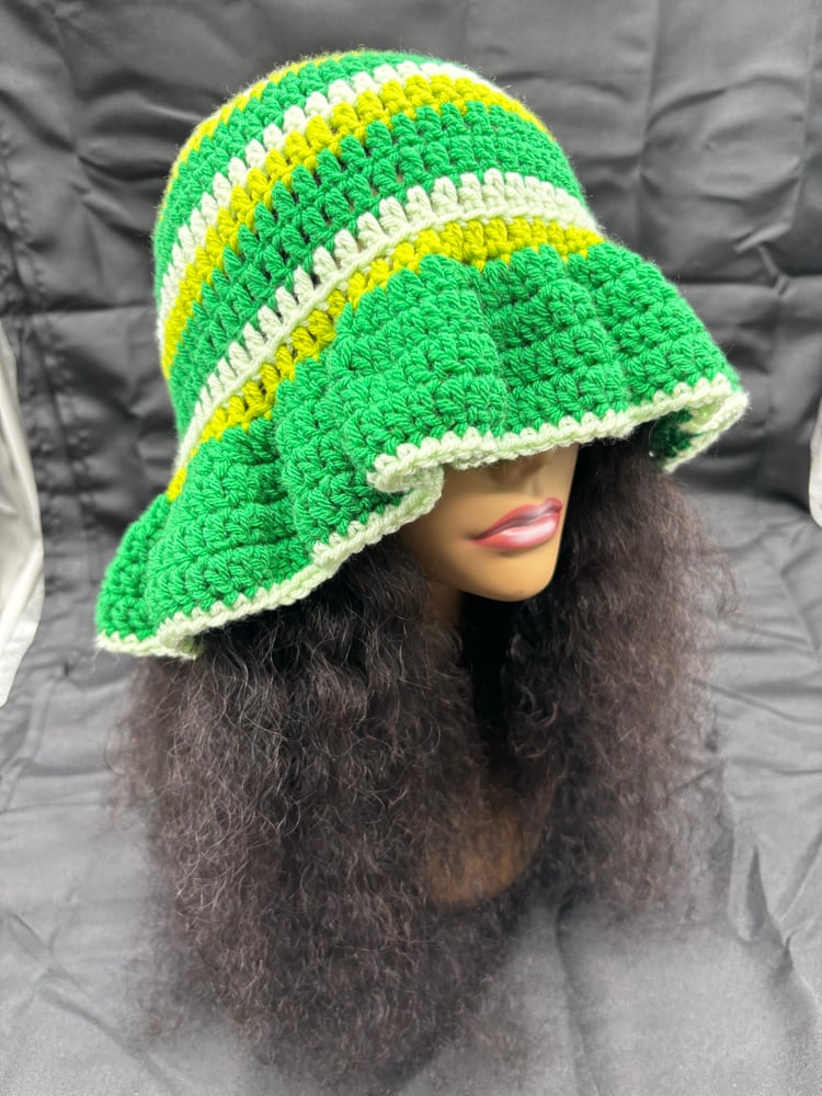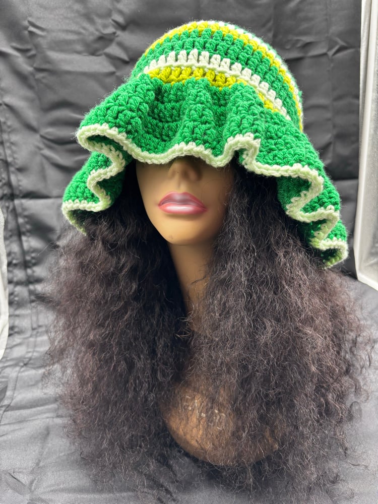 Handmade crochet bucket hat in vibrant green tones with a dramatic ruffle brim and soft green trim. A bold statement piece designed to stand out.