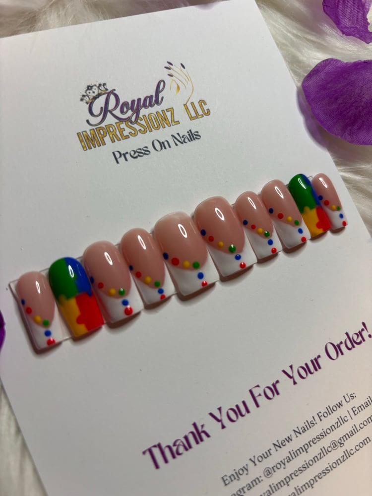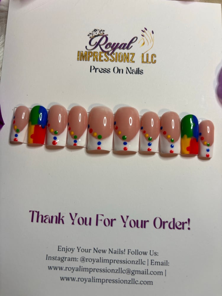 Perfectly Unique features a classic nude base with crisp white tips, finished with colorful dot accents and hand-painted details inspired by the beauty of individuality.