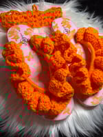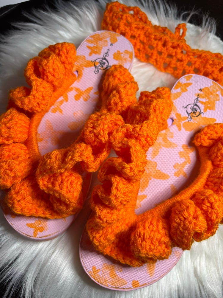 Handmade crochet ruffle flip-flops in vibrant orange. Soft, stylish, and perfect for adding a fun pop to your outfit.
