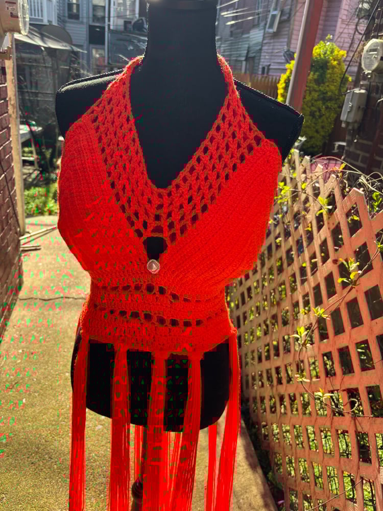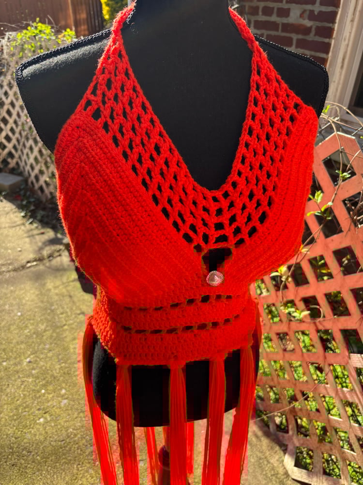 The Siren Fringe Top is a custom, handmade piece designed to hug your body and move with you. With dramatic fringe detailing and a bold silhouette, this top was created for moments where subtle just isn’t an option.